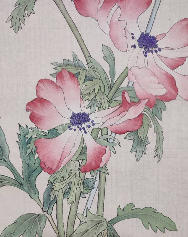 | 墨色分染 花上胡粉(白色)打底,葉子需墨色分染打底 | 講師講解與示範,學員畫作品,個別指導與提問 為了讓花卉的形象由2D變3D,平面變立體,墨色的分染是很重要的步驟,由淡墨依葉子的明暗一層一層的分染,約少則3-4層,多則7-9層。 |
